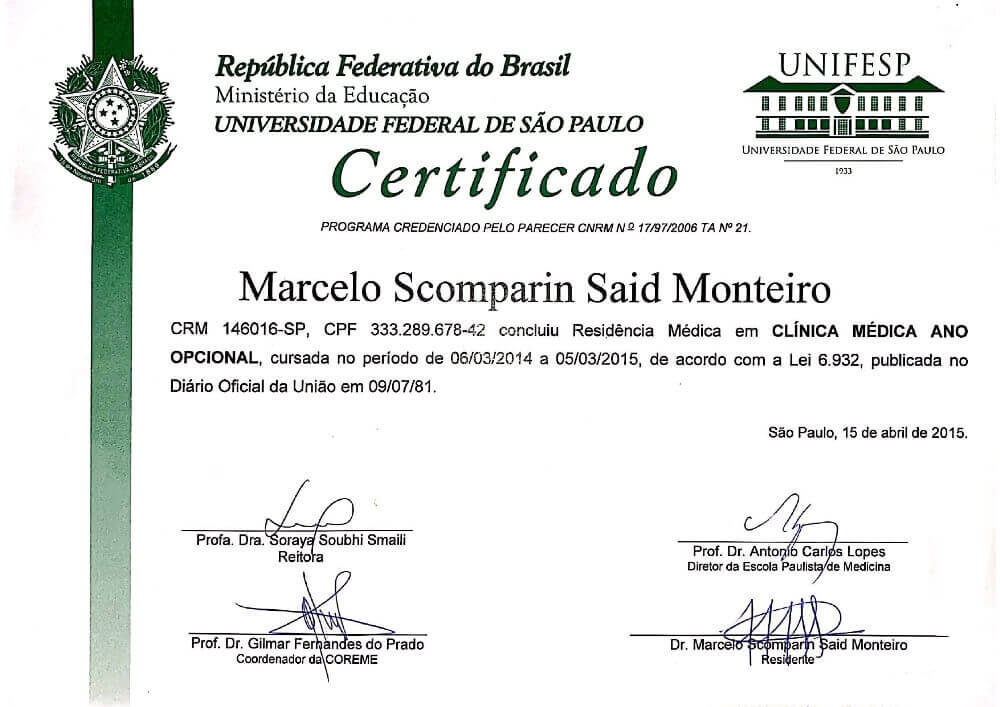 Residência Clínica Médica Ano Opcional (R3): Universidade Federal de São Paulo 2014- 2015;