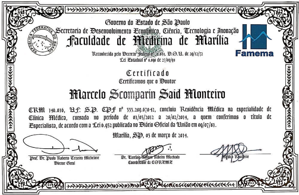 Residência Clínica Médica: Faculdade de Medicina de Marília (2012- 2014);