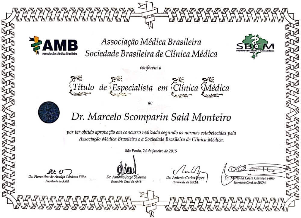 Título de Especialista em Clínica Médica: Sociedade Brasileira de Clínica Médica (SBCM) – 2015;