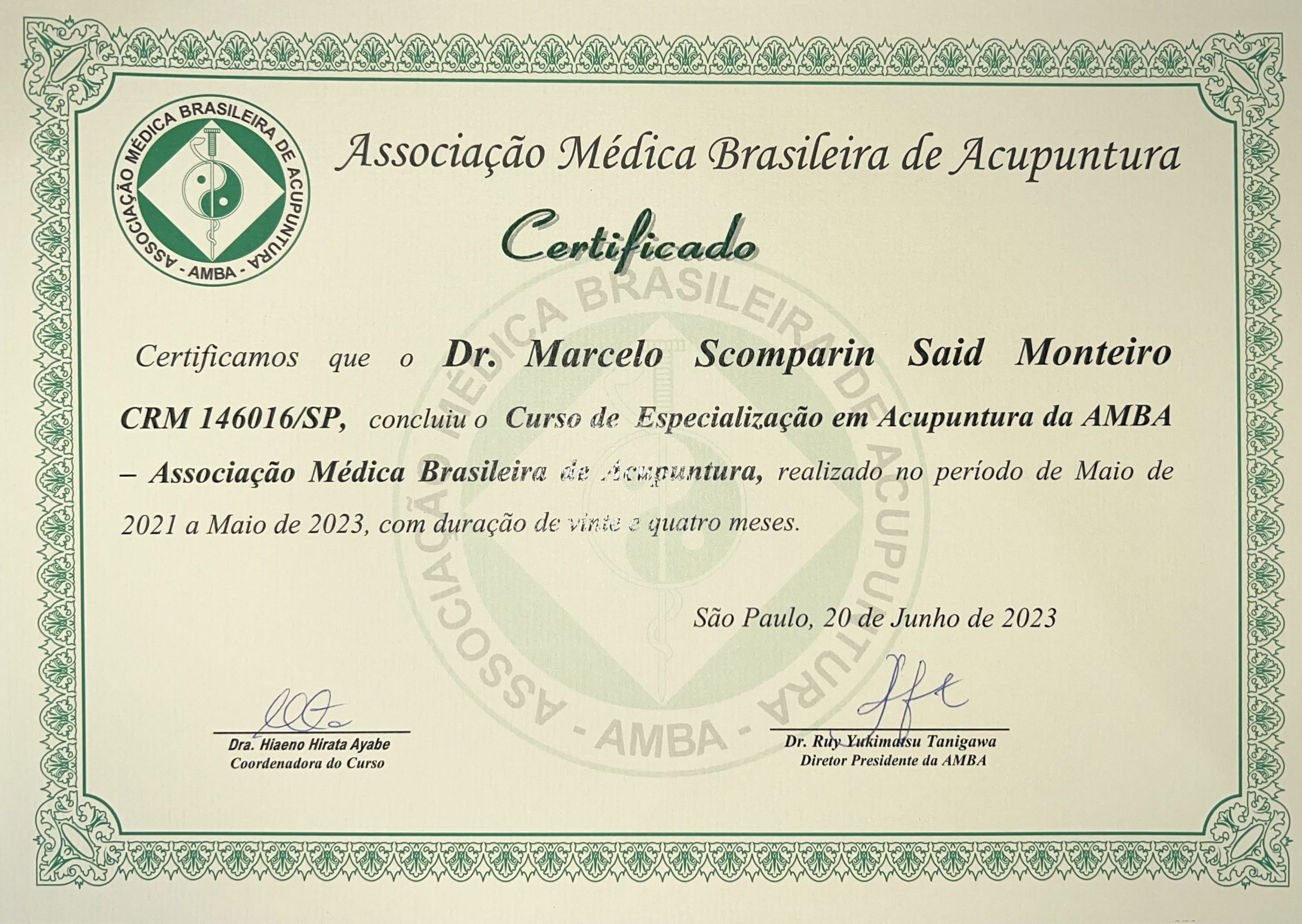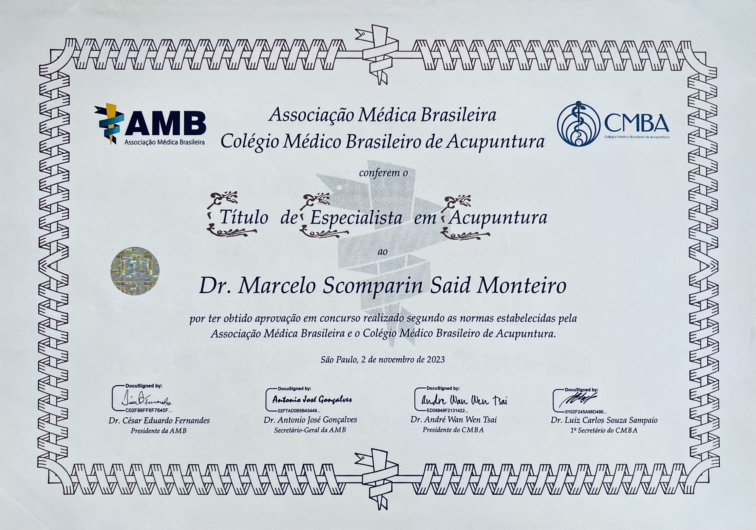 Título de Especialista em Acupuntura : Colégio Médico Brasileiro de Acupuntura ( CMBA) – 2023.